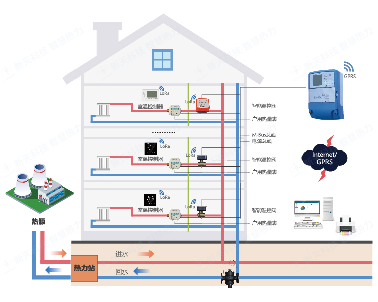 温控一体化计量系统,采用户用远传超声波热量表进行计量和分户温度调节相结合的方式。主要由户用远传超声波热量表、智能温控阀、室温控制器、采集计算器组成。用户通过室温控制器灵活调节室温,户用远传超声波热量表实时记录用热数据。本系统既满足了分户计量用热量的要求,又达到了分户调温的目的,实现按需供热,节能增效。